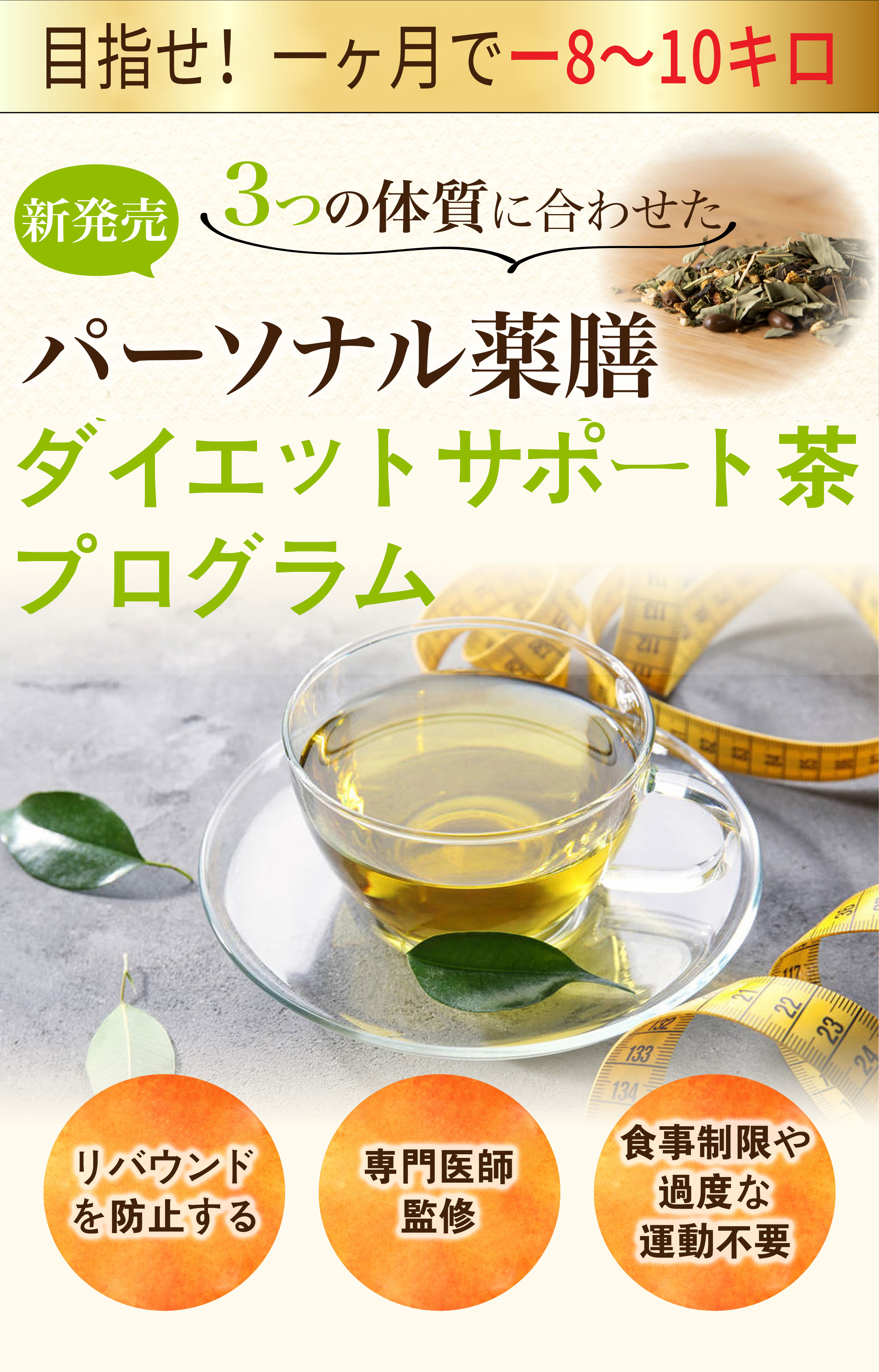 断食やファスティングなどをする必要がなく、食事制限などは一切ありません。過度な運動をする必要もないので、続けられることが可能です。普段の飲み物を薬膳茶に置き換えることで、体内に蓄積している毒素を排出して、脂肪を燃焼させる酵素の働きを高めて太りにくい体になるので、リバウンドの心配もありません。