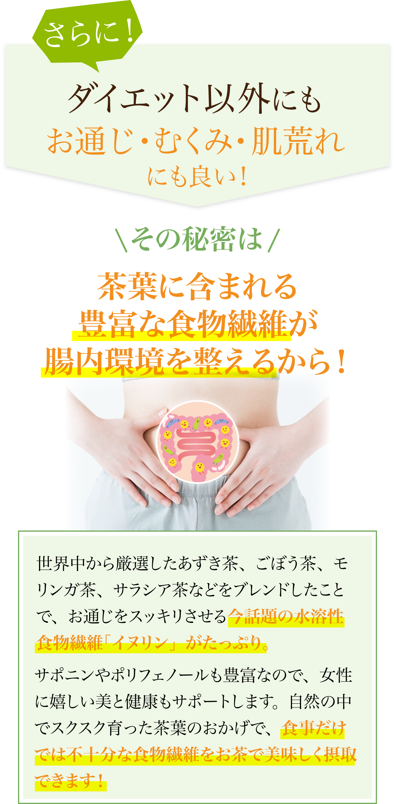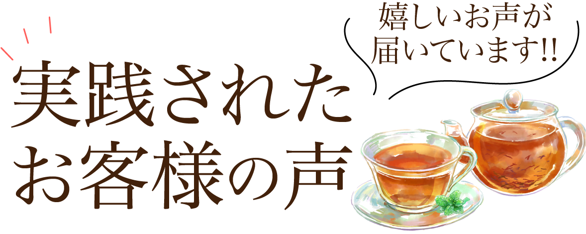 昔からお通じが出悪く、3日も出ないひどい時もありました。そんな時にめぐりこまちの商品を知って購入してみました。薬膳茶は初めてで、不味そうなイメージがありましたが、スッキリ甘くて美味しいので飲み続けています。このお茶を飲み始めて、2日目にお通じがスルッとスッキリした時には、「えっ、本当に!?」と思わずびっくりしてしました。体重の方も1ヵ月ほどで-8kgも痩せることができて私には合っているようです。目標は-2kgなので、これからも飲み続けたいと思います。